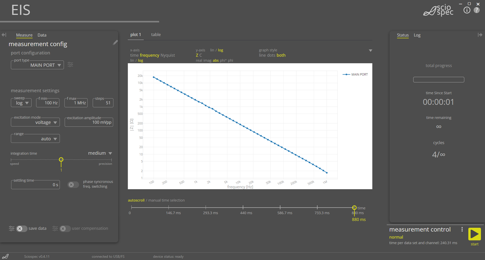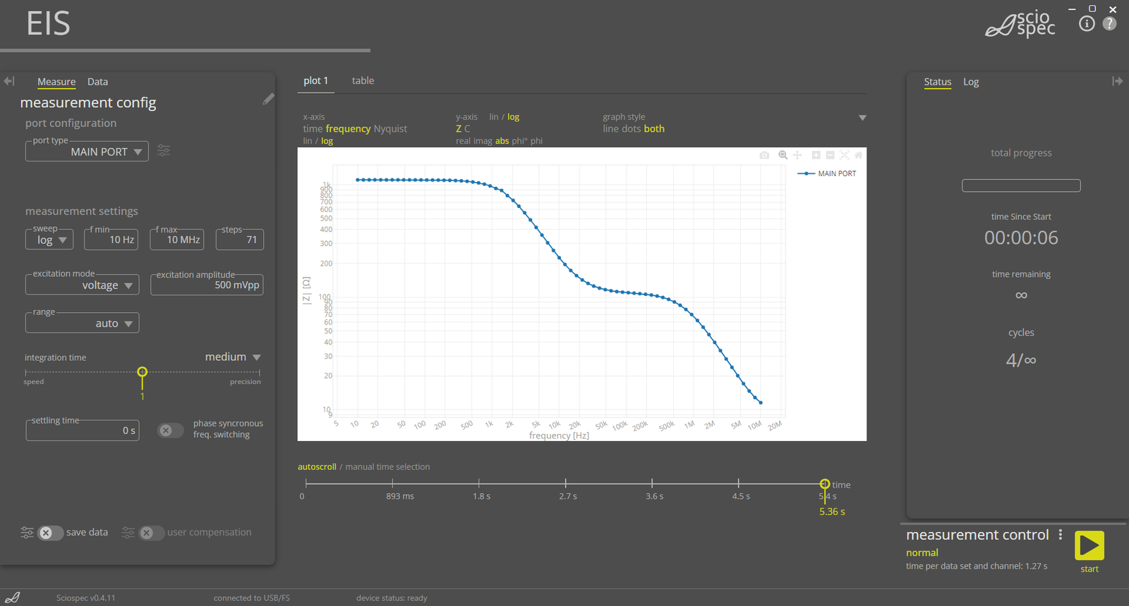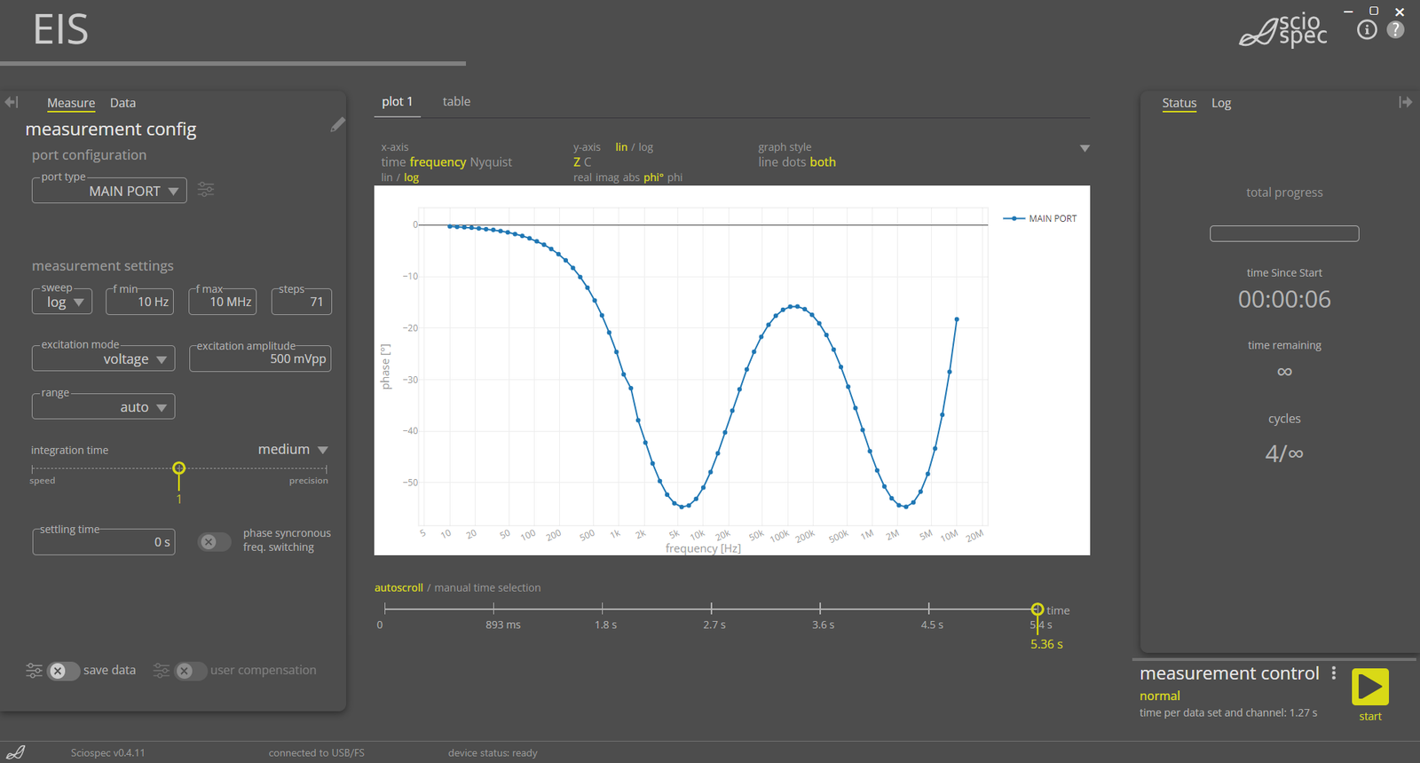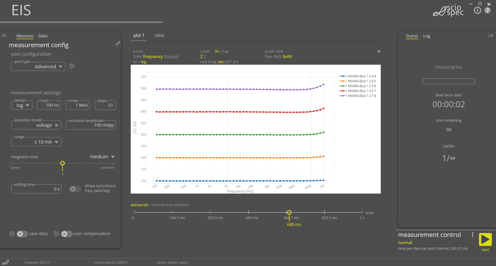Das ISX-3 mini ist mit Sciospecs IF-Frontend ausgestattet. Im Messbereich DC bis 10MHz (optional auch bis 40 oder 100 MHz) wird ein Dynamikbereicht von 180dB (Ohm…GOhm) und eine Basis-Präzision besser als 0.1% erreicht. Die zwei gemultiplexten 4-Electroden-Messkanäle mit MCX-Anschlüssen erlauben einfache Vergleichsmessungen zweier Testobjekte oder Sensoren.